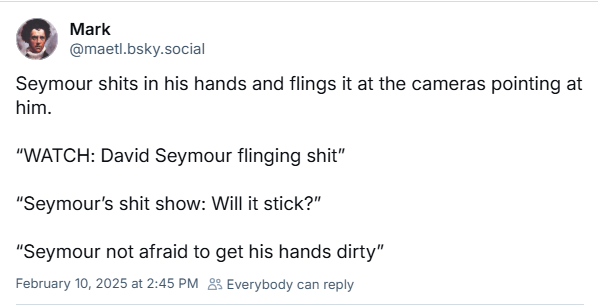 A couple of weeks ago, comedian Guy Williams lobbed some pointed questions at David Seymour about his racist Treaty Principles Bill and anti-Māori comments he has made throughout his political career. There was nothing particularly masterful about his approach but to our journalistic class, he had committed a grave sin. Not only had he broken kayfabe,3 but this was a lowly jester acting like he was one of the elite. As Madeleine Chapman said in her piece for The Spinoff “comedians who sometimes do journalism are not the same as full-time, working journalists.”
