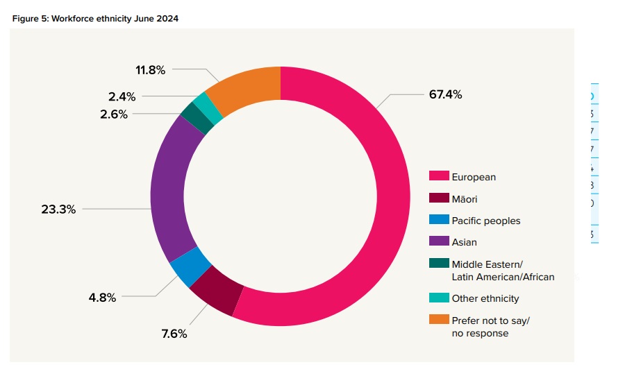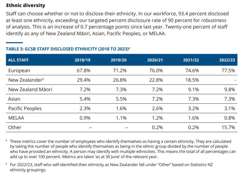 Secondly, there is the category of ‘Other Ethnicity’ which is intended to capture groups that have statistically small populations in New Zealand (e.g. Indigenous Americans) but which has become in practice the refuge of the scoundrel. A white person who self-identifies as ethnically ‘New Zealander’ (i.e. the most annoying person you know) will be included in this category. Note that the GCSB hires a significant proportion of staff whose ethnicity was ‘New Zealander’ until 2022/23 and are now recorded as ‘Other’. I also suspect that MBIE does not employ 8.1% Native Americans and this group includes a significant amount of Pākehā. This category is particularly egregious because when PSC reports the data, they will be defined as ‘Other’ (6.7% of the public sector in 2024) rather than ‘European’ (62.2% in 2024)