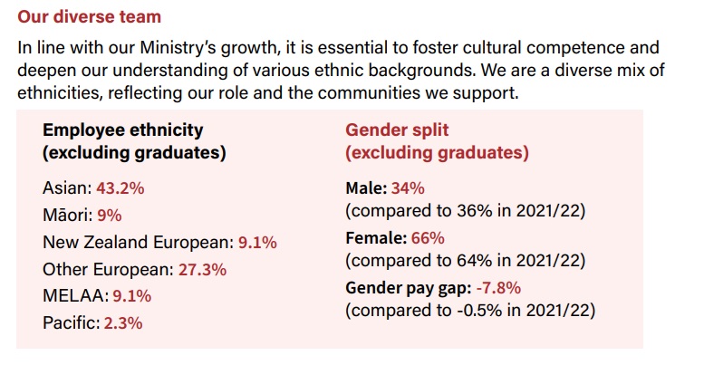 The PSC is not Stats NZ and cannot apply the same rigour to its data. It is very reliant on the information it receives from across the sector. For example, the 2021 Public Service Census, Te Taunaki had a response rate of 63.1% (i.e. it wasn’t really a census). Moreover, the Workforce Data on Diversity and Inclusion that PSC reports annually (most recently on 10 October) is based on HR records. What this means is that there is plenty of scope for those working in HR to present a sanitised version of their workforce. At the end of the day and despite any audit requirements, the primary purpose of an Annual Report is to serve as a PR document for an organisation.