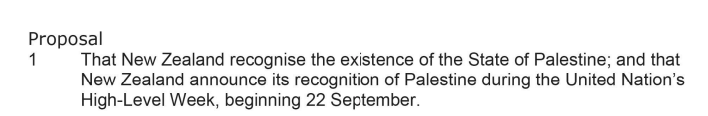 • 16 August - the skeleton of a draft Cabinet paper with the recommendation "Agree that the Minister of Foreign Affairs will announce New Zealand's recognition of Palestine at the United Nations in the week of 22 September."