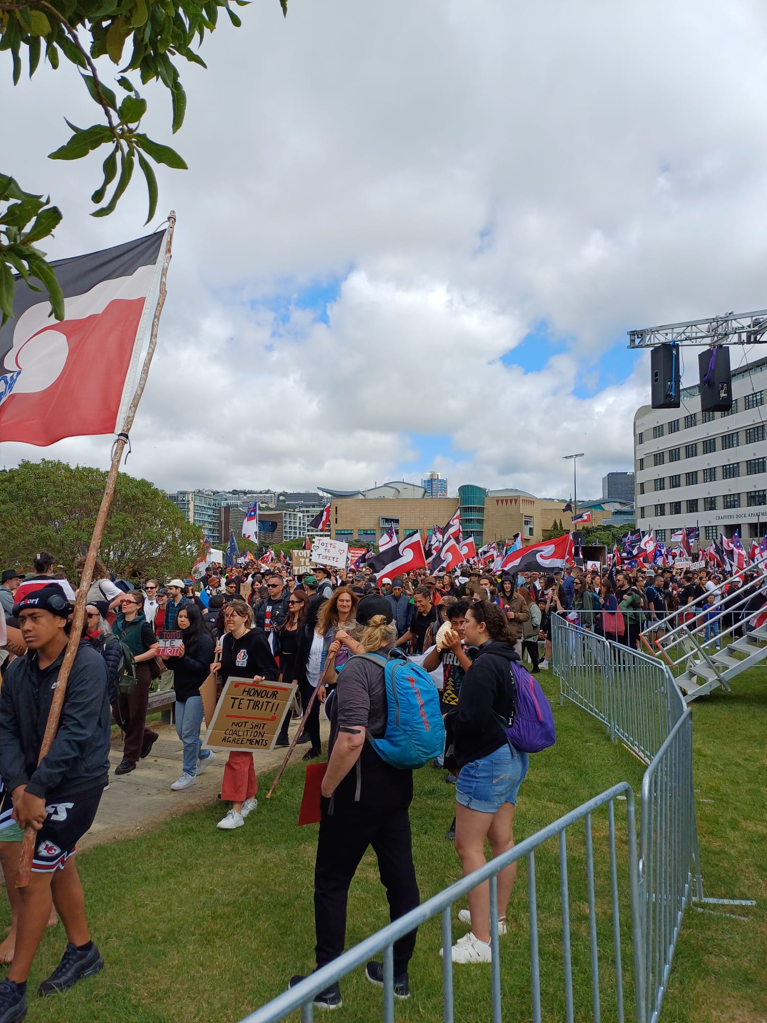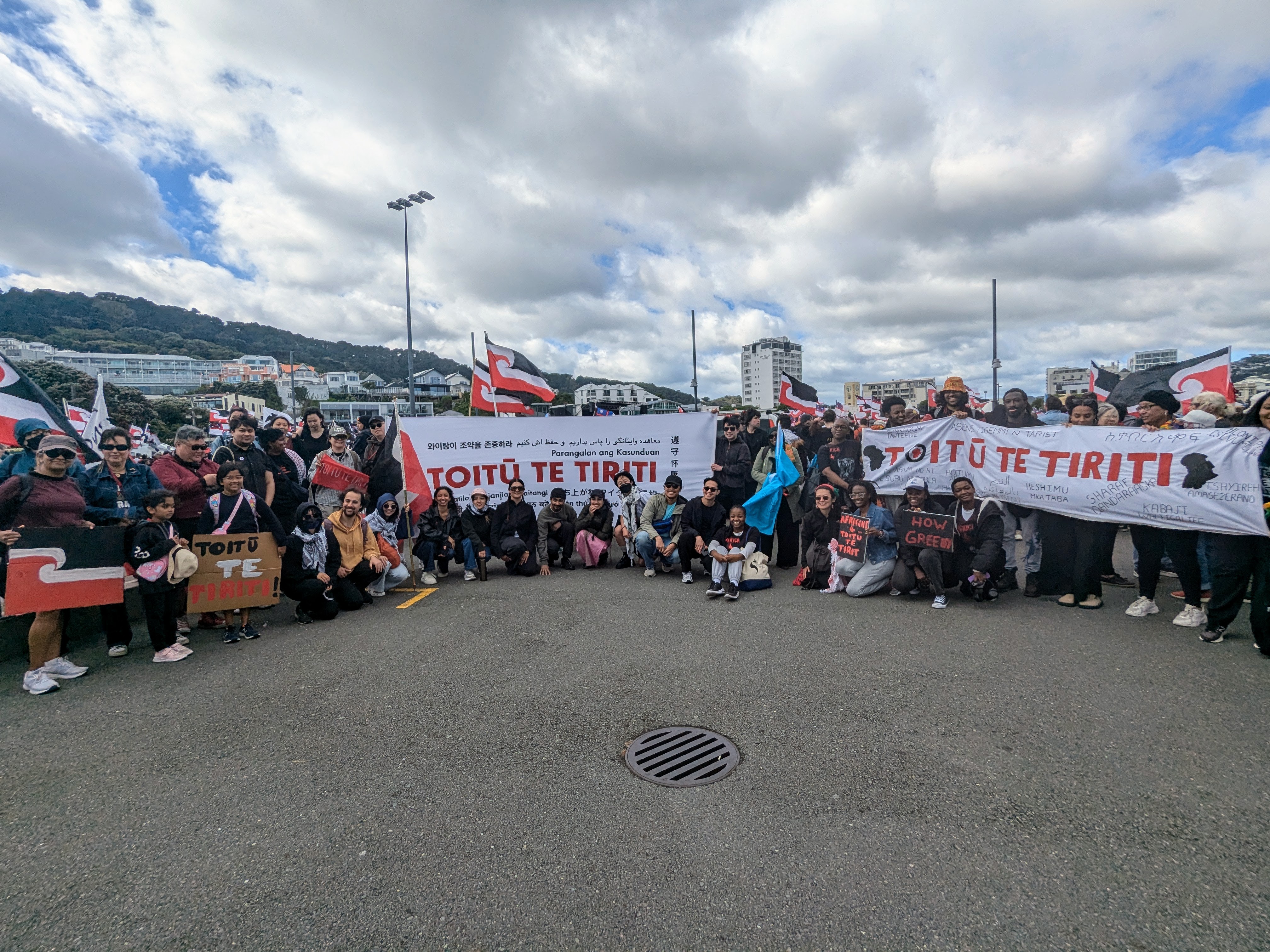 It was explicitly non-partisan with Taranaki Whānui, mana whenua for Parliament grounds laying down Te Kahu o Te Raukura, the cloak of aroha and peace (previously laid in response to the 2022 parliament occupation). It was much more diverse than the 2004 hīkoi with pākehā and tauiwi stepping up to support it. On-the-ground, the huge number of affiliations could be seen in volunteers wearing hi-vis vests bearing the logos of the various groups that had donated them: unions, Justice for Palestine, Wellington Pride. It could be seen in the kai that had been donated by the Muslim, Sikh and Cambodian communities. In my role volunteering for Treaty Action Group, I helped with fundraising for the Wellington event and saw hundreds of small donations from individuals around the motu with a handful of slightly-larger donations from activist groups (not political parties). The idea of kotahitanga that was so central to the tikanga and could be seen at every level.